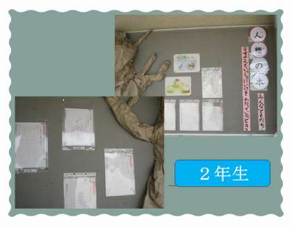 2年生は、『およげない りすさん』という教材文を使って、学習をすすめ、体育館前の「人権の木」に掲示していました。