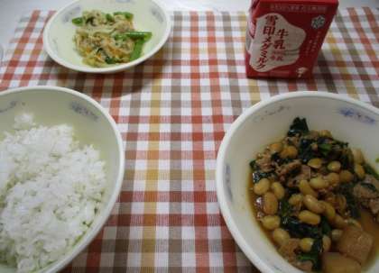 今日の献立は、「麦ごはん・肉みそ炒め・ツナと切干大根の炒め煮・牛乳」でした。
