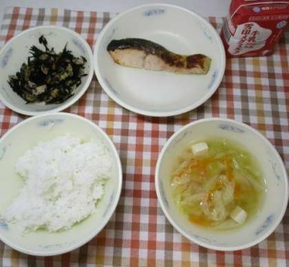 今日の献立は、「ごはん・キャベツのすまし汁・鮭の塩こうじ焼き・ひじきの煮つけ・牛乳」でした。
