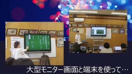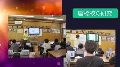 全教員、タブレット端末を持ち寄り、会議室にて研修を行いました。毎時間、児童がどんなことを考えていけばよいのかを、国語科を中心にして学び合いました。各学年が毎時間の板書のプレゼンテーションを作り、全員で共有し合うことができました。
