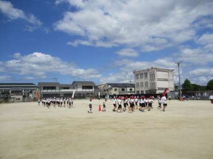 旗をたなびかせ、颯爽と入場してくる5年生。いろいろと作戦をたてながら、がんばっている様子がうかがえます。クラスで考えた言葉や踊りも素敵です。