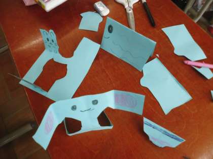 紙を折って立ち上げた、楽しい形を作りました。おうち、恐竜、動物たち、乗り物、お山…。楽しい仲間が並び、教室に楽しい世界が広がりました(^^)