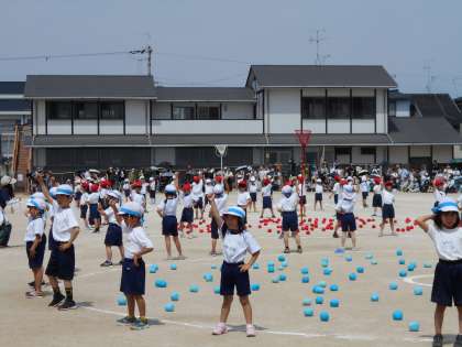 1年生の団体競技「チェッコリ玉入れ!」が行われました。かわいい音楽に合わせて、ダンスをおどったり、懸命に玉をかごにむかって投げたり,がんばる様子が見られました。