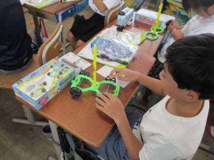今後、いろいろと確かめるための実験セットを受け取って、子どもたちはとてもうれしそうです。内容物を確認し、しっかり名前を書いて、早速少し作り始めました。