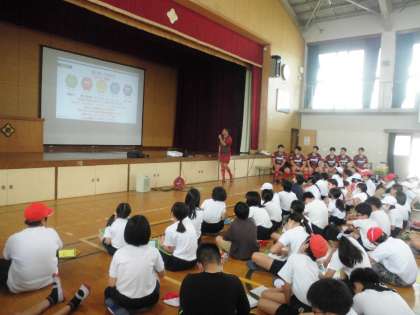 総合的な学習の時間では「働くこと」について学んでいます。そこで、今回は島津製作所のラグビー部の方々にお越しいただき、なぜ働いているのか、どんなことをやりがいに感じながら仕事をしているのか、仕事を続けていてよかったことはどんなことかなど、たくさんの質問をさせていただきました。そのあとは、ラグビーの体験を一緒にさせていただき、とても充実した時間を過ごすことができました。