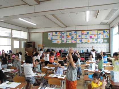 今日は、あさがおのつぼみはどんな形かな?と教科書の挿絵を参考につぼみになりきっていました。
