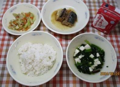 今日の献立は、麦ごはん・牛乳・さばのかわり煮・キャベツのごま煮・すまし汁でした。