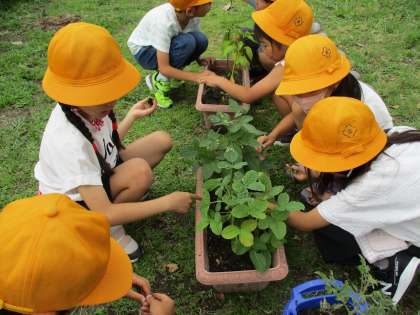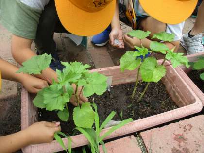 2年生みんなで育てている夏野菜に花が咲き、小さな実が付き始めています。