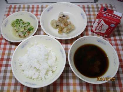 今日の献立は、ごはん・牛乳・はものこはく揚げ・ピーマンのごまいため・赤だしでした。今日はなごみ献立でした。