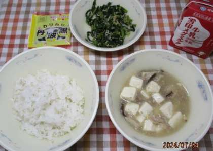 豚肉と豆腐のくず煮は、ごはんによく合っていました。また、大根葉とじゃこのいためものは、「じゃこ」がいいアクセントになっていました。