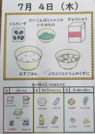 今日の献立は、「大根葉とじゃこのいためもの・豚肉と豆腐のくず煮・麦ごはん・牛乳」でした。給食カレンダーには、体をつくる働きがある「赤」の食べ物について書かれてありました。今日の給食には、栄養素「赤」の食べ物が5つありました。見つけられましたか。答えは、「牛乳・豚肉・豆腐・しらす干し・黒大豆」です。