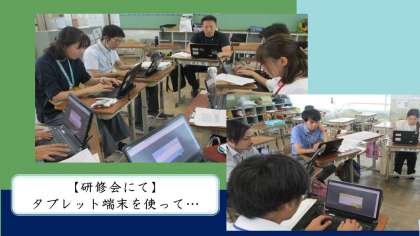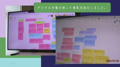 以前は、付箋を使って拡大コピーしたものに思いや意見を交流していましたが、今日は、タブレット端末を使ってデジタル付箋を使ってみました。今後の研究のあしあとをデジタルで残すためです。残したり、見直したりできるデジタルの良さを改めて感じました。