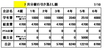 金額をご確認の上、7月9日(火)迄に、ご入金をお願いします。現金納入になりませんよう、保護者のみなさま、どうぞご協力ください。