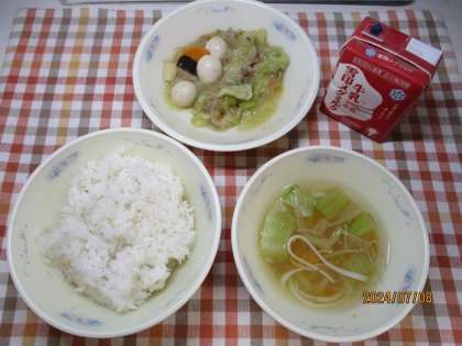 今日の献立は、麦ごはん・牛乳・うずら卵とキャベツのいため煮・ミーフンスープでした。