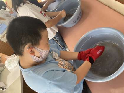 みるみる洗濯液が黒ずんできました。洗濯機を使用している家庭がほとんどですが、手洗いをすることで洗濯の必要性や機械洗いとの効果の違いを実感することができました。