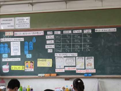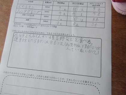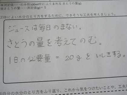 そこで、体によい水分のとり方をするために、できそうな工夫をそれぞれ考えてみました。「ジュースは飲まない」「砂糖の量を考えて飲む」「1日の必要量の20グラムを意識する」「水分をよく含んでいる夏野菜等を食べる」などの工夫が出ていました。
