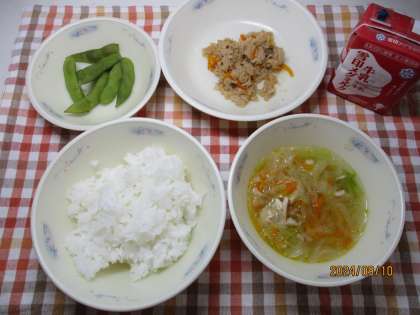 今日の献立は、ごはん・牛乳・おからツナ丼(具)・枝豆・キャベツのすまし汁でした。