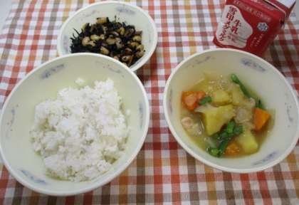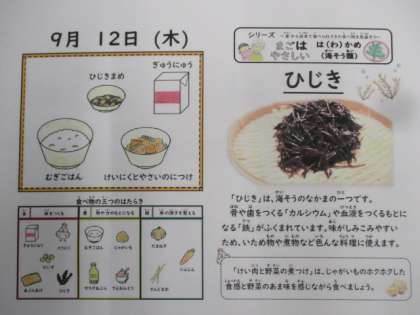 今日の給食は、「麦ごはん・ひじき豆・鶏肉と野菜の煮つけ・牛乳」です。ひじきは、海藻のなかまの一つで、骨や歯をつくる「カルシウム」や血液をつくるもとになる「鉄」が含まれています。味がしみ込みやすいため、炒め物や煮物などいろんな料理に使えます。ひじき豆は、ご飯によく合いました。
