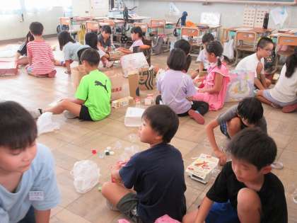 空き箱やキャップ、紙コップ名をを上手に使って、いろいろなあそびを考えて楽しそうにしていました。