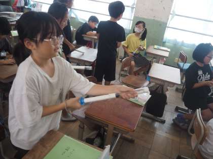 空気てっぽうの角度や押す速さなどを変えながら玉の飛ぶ距離を実験しました。
