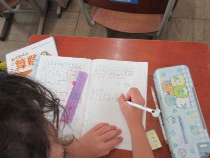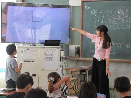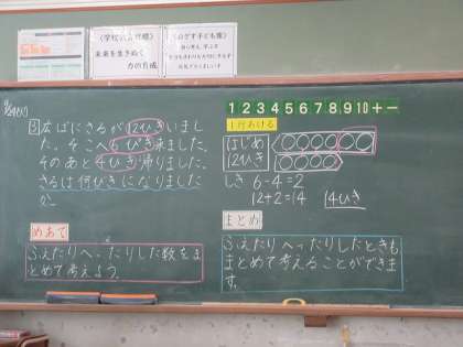 自分が考えたことを、みんなの前で発表していました。ふえたりへったりしたときも、まとめて考えることができますとまとめをしていました。