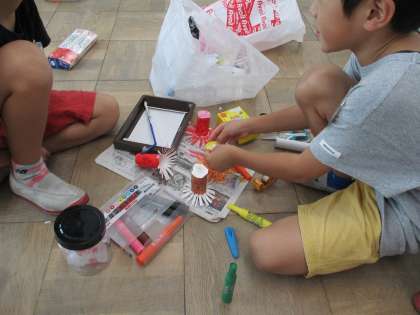 家から持って来た廃材が子ども達のアイデアで楽しいおもちゃにどんどん変身しています。輪ゴム、つまようじ、古電池、クリップ、ストローなどを組み合わせることで、遊びの幅もぐんと広がっています。