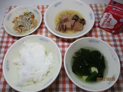 今日の献立は、ごはん・牛乳・なま節のしょうが煮・もやしの煮びたし・すまし汁でした。