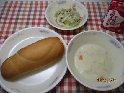 今日の献立は、コッペパン・牛乳・白いんげん豆のチャウダー・ツナサンドの具(フレンチ味)でした。