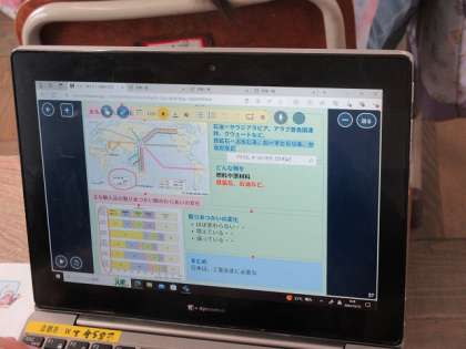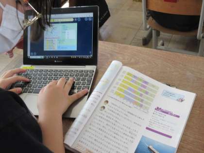 タブレットに教科書をよく見て入力していました。