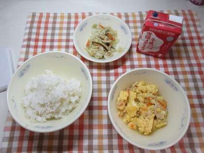今日の給食は「麦ごはん・牛乳・親子煮・ごまず煮」でした。