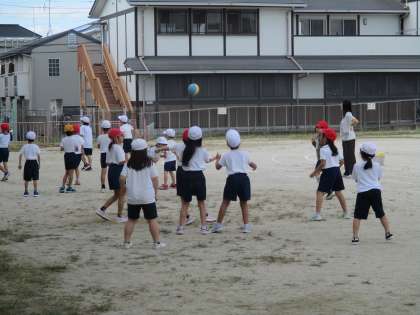 投ゲ遊びでは、色々な投げ方の練習をした後、みんなでドッジボールのゲームをして楽しみました。