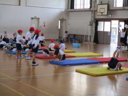 今日は、「なげあそび・マットあそび」の単元の最終日でした。