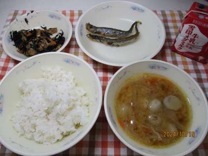 今日の献立は、麦ごはん・牛乳・ししゃものから揚げ・ひじきの煮つけ・豚汁でした。