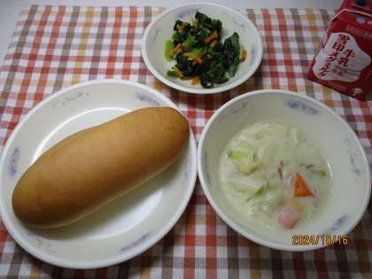 今日の献立は、ミルクコッペパン・牛乳・キャベツの米粉クリーム煮・小松菜のソテーでした。