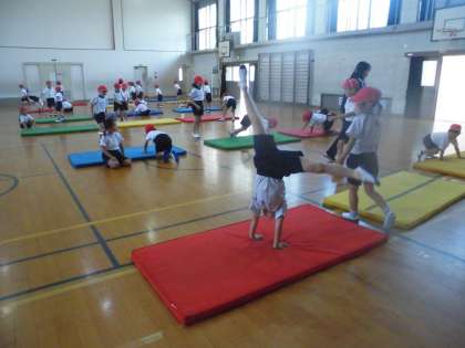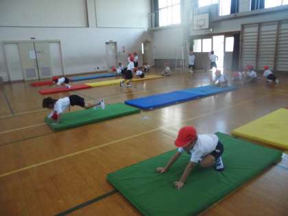 体育のマット遊びでは、いろいろな技に挑戦し、レベルアップしています。前転がりでは、背中を丸くして、なめらかに転がれるようになってきました。うさぎとびは、より遠くに手をついて、腰を上げて跳べるようになってきました。