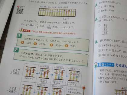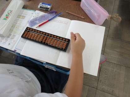 算数は「そろばん」です。一の位、十の位、百の位の位どりから、数字を入れていきました。
