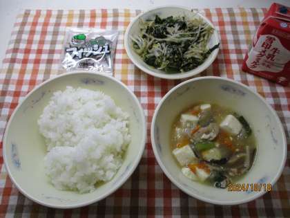 今日の献立は、ごはん・牛乳・豚肉と豆腐のくず煮・ほうれん草ともやしのごま煮・じゃこでした。