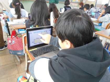 「分けて考える」「引いて考える」など、これまでの求積方法を使って考えました。タブレット端末に補助線をひいたり、計算式をかいたりしながら、答えを見つけることができていました。