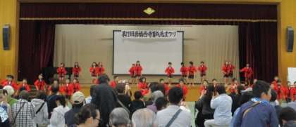 民舞『よっちょれ』を八条中学校の体育館にて披露しました。3年生の「どっこい、どっこい、どっこいしょ。」「よっちょれ、よっちょれ、よっちょれやー。」というかけ声が体育館中に響き渡りました。
