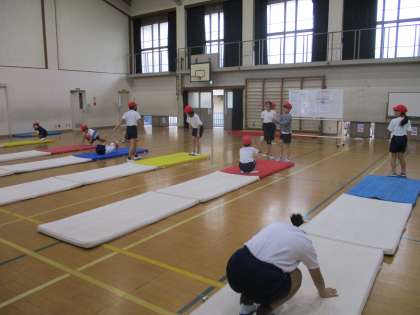 体育科では『マット運動』の学習を進めています。「もう少し足をのばしたほうがいいよ」などと声をかけあいながら技に挑戦しています。