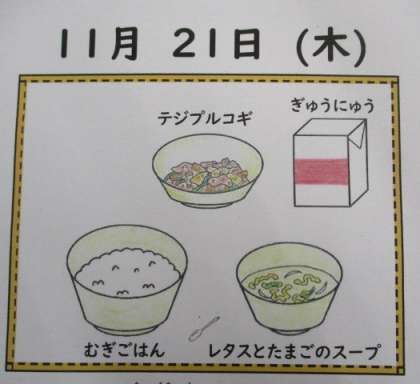 今日の給食は、「麦ごはん・テジプルコギ・レタスと卵のスープ・牛乳」でした。