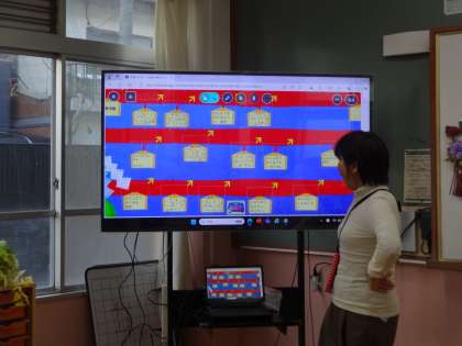 学習支援ソフトを使って、絵馬に新年の目標やお願いを書きました。「英語がうまくなりますように」「読書で100冊読めますように」「ピアノがうまくなりたい」「ダンスがうまくなりたい」等、たくさんの思いをペンやキーボードを使って入力しました。入力した絵馬を、ロイロ神社に飾りました。たくさん飾られた絵馬に、とても満足していた子ども達でした。