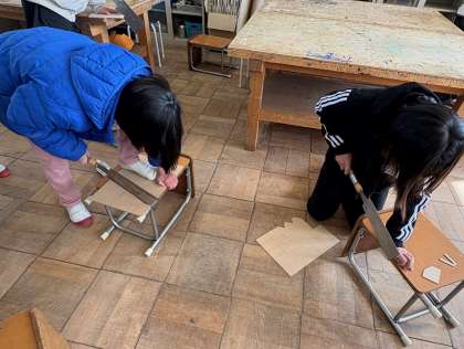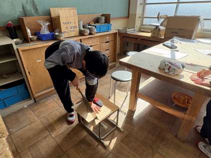 図画工作科では「ギコギコトントンクリエイター」の学習を進めています。のこぎりの使い方に気を付けて安全に取り組むことができています。完成が楽しみです。