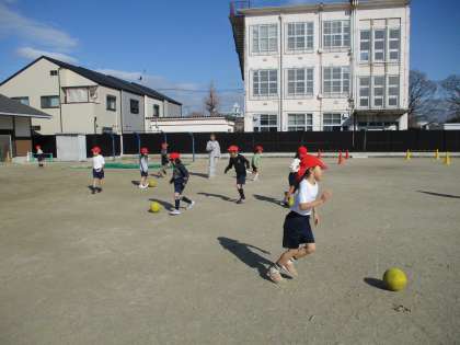 ドリブルをしたり、ボールをけってシュートしたり、ボールを足で操作する活動をしました。はじめは「寒い〜!」と言っていた子たちでしたが、授業の終わりには、「暑いから半袖で平気!」と元気いっぱいの笑顔でした。