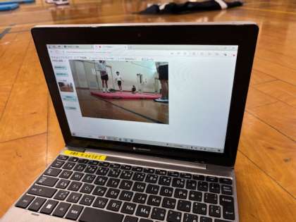 お手本の動画と自分の動画を比べながら、開脚前転や側方倒立回転などの技に磨きをかけています。