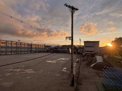 今日は、お昼ごろから雨が降りはじめたため、残念ながら、子どもたちは放課後遊びができませんでした。子どもたちが帰った後、雨が上がった運動場に目を向けると・・・きれいな夕日が、運動場と校舎を照らしていました。