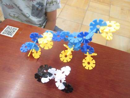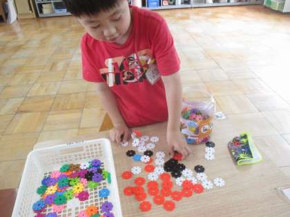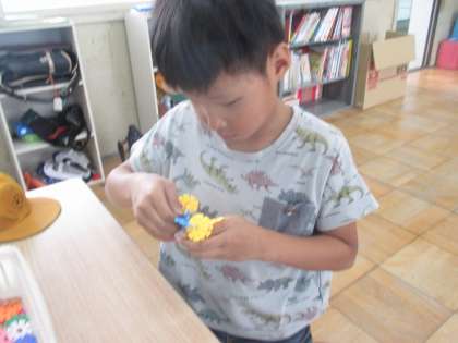 小さな歯車型のパーツを組み合わせて造形活動をしています。カラフルな色に引かれて、好きな色を集めたり、車や鳥など「おおっ」と思わず、声に出てしまう作品作りをしたり、