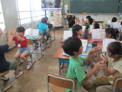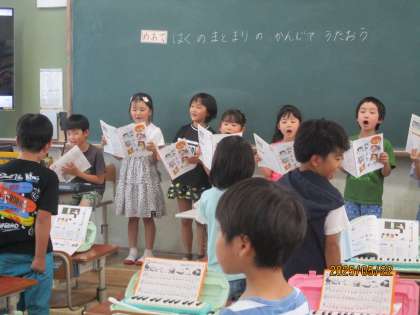 音楽では、2拍子や3拍子に合わせて手を叩いたり、リズムに合わせて歌ったりする学習をしています。手をたたくことに夢中になってしまい、リズムがずれてしまうこともありますが、楽しそうに友達と一緒にはくを感じている様子です!