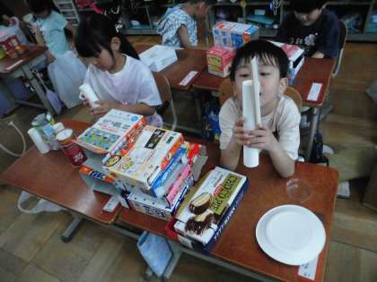 「ころがる ころがらない」「しかく まる」「たつ たたない」など二人で考えながらグループに分けていました。