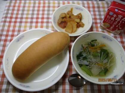 今日の献立は、「コッペパン・牛乳・ソーセージとポテトのケチャップサンド(具)・スープ」でした。